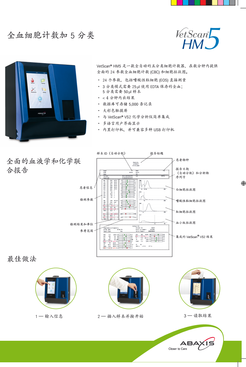 全血細胞計數(shù)加5分類,集成式獸醫(yī)血液診斷,在數(shù)分鐘內(nèi)提供全面的22參數(shù)全血細胞計數(shù)(CBC)和細胞柱狀圖,包括嗜酸性粒細胞(EOS)直接測量,檢測對象:馬、牛、豬、羊、小型哺乳動物等。
